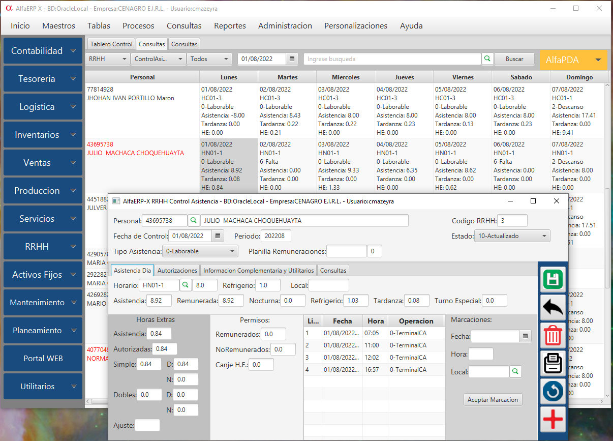 AlfaRRHH-Control Asistencia como todos los modulos de AlfaERP se personaliza a los requerimientos especificos de nuestros Clientes.