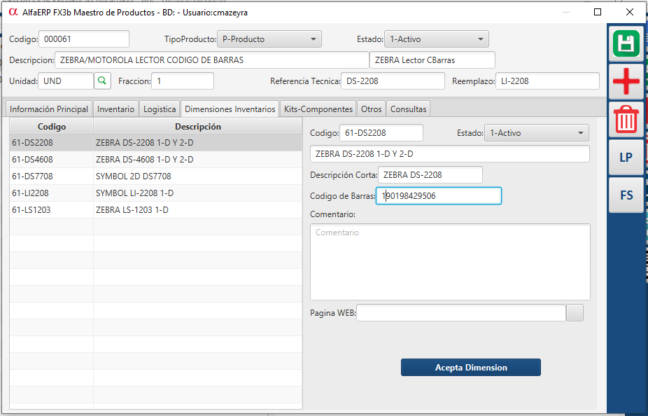 nuestro registro en el Maestros de Producto.