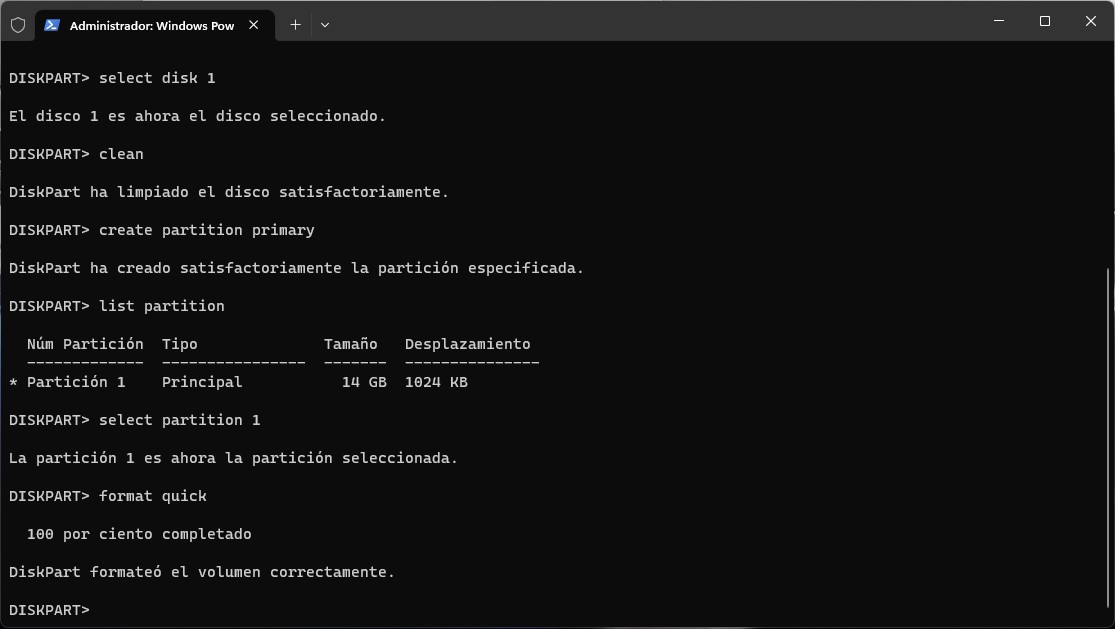 • select partition 1: Seleccionamos la partición que acabamos de crear.