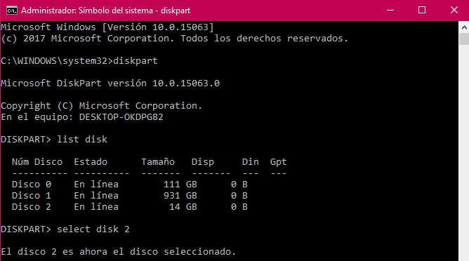 • select disk NUMERO_DE_DISCO_DEL_USB: Si la memoria USB es el disco 2, por ejemplo, escribiremos el comando select disk 2.